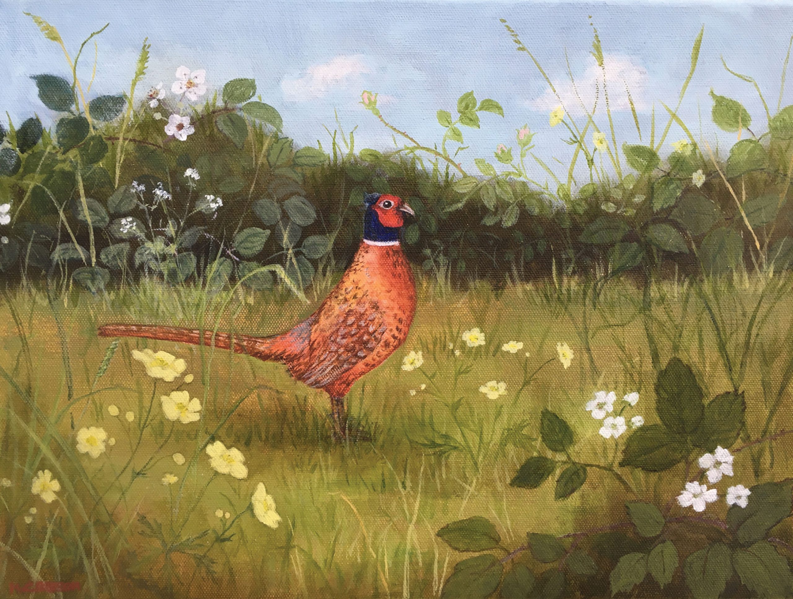 Look at me! by Mary Gibson Posted 09/04/2024 by gibsonstudio Title: Look at me! by Mary Gibson. Inspired by the superior attitude of the pheasant as it struts around the field. Original water based oils on canvas. Size 40 x 30cms. Including wooden frame, £245.