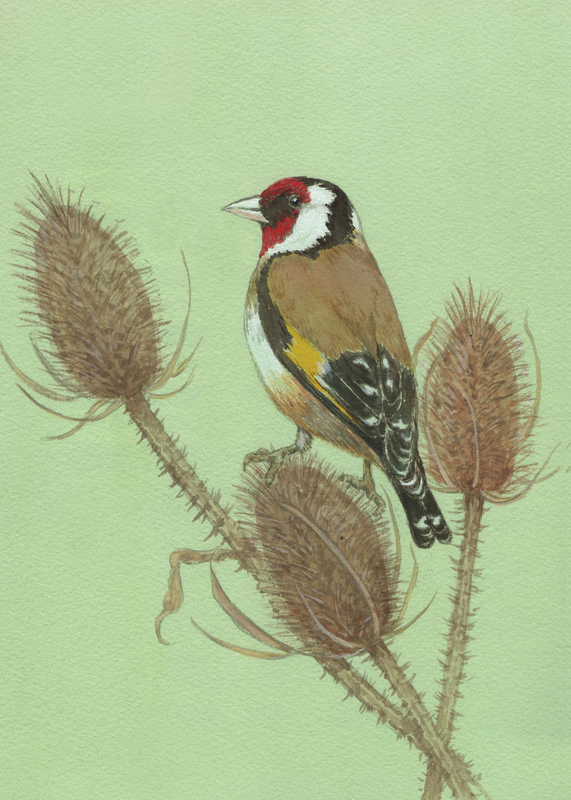 Goldfinch by Mary Gibson. Water colour and gouache on paper. Size W21 x H29.7cms. Prints are available at £33.