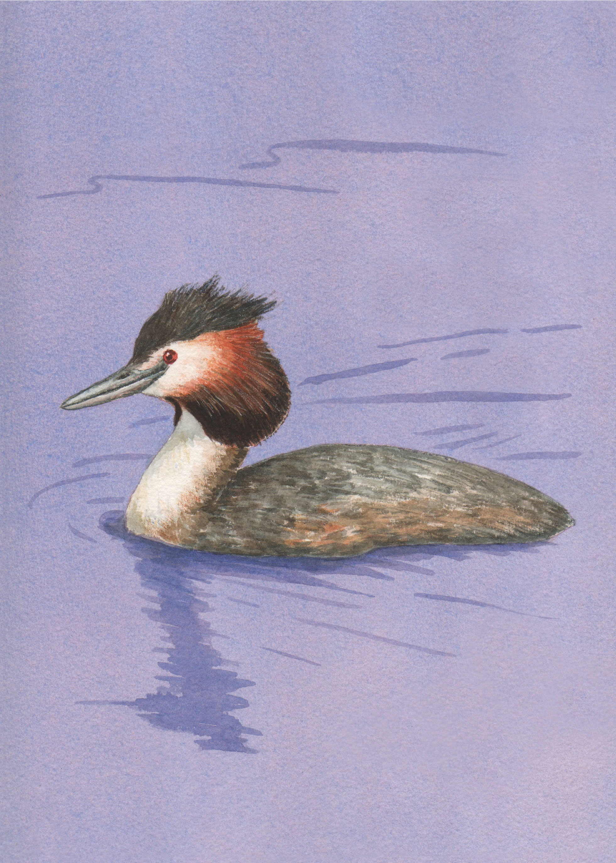Crested Grebe. Water colour and gouache paper. Size W21 x H29.7cms. Prints are available at £33.